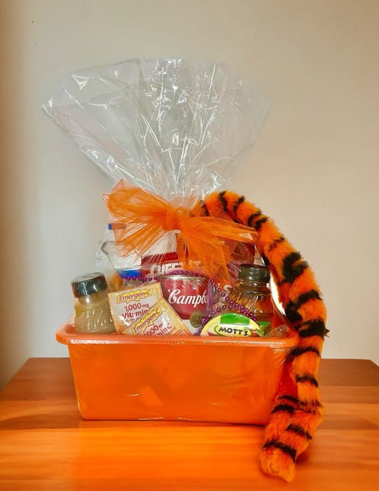 The Tiger Get Well Basket is full of TLC. It's just the thing to send your student when they are feeling a little under the weather. It includes two cans of Campbell's chicken noodle soup, 2 orange juices, 2 apple juices, ramen noodles, Goldfish crackers, Cheeze-its, 2 containers of apple sauce, bottled waters, cough drops, 2 packets of Emergen C, Advil, peppermints, and a small package of tissues. We will include your personal message on a Get Well Soon card, shrink-wrap it, tie it up with a bow and add one of our plush tiger tails before we deliver it to your student at their dorm or local residence.