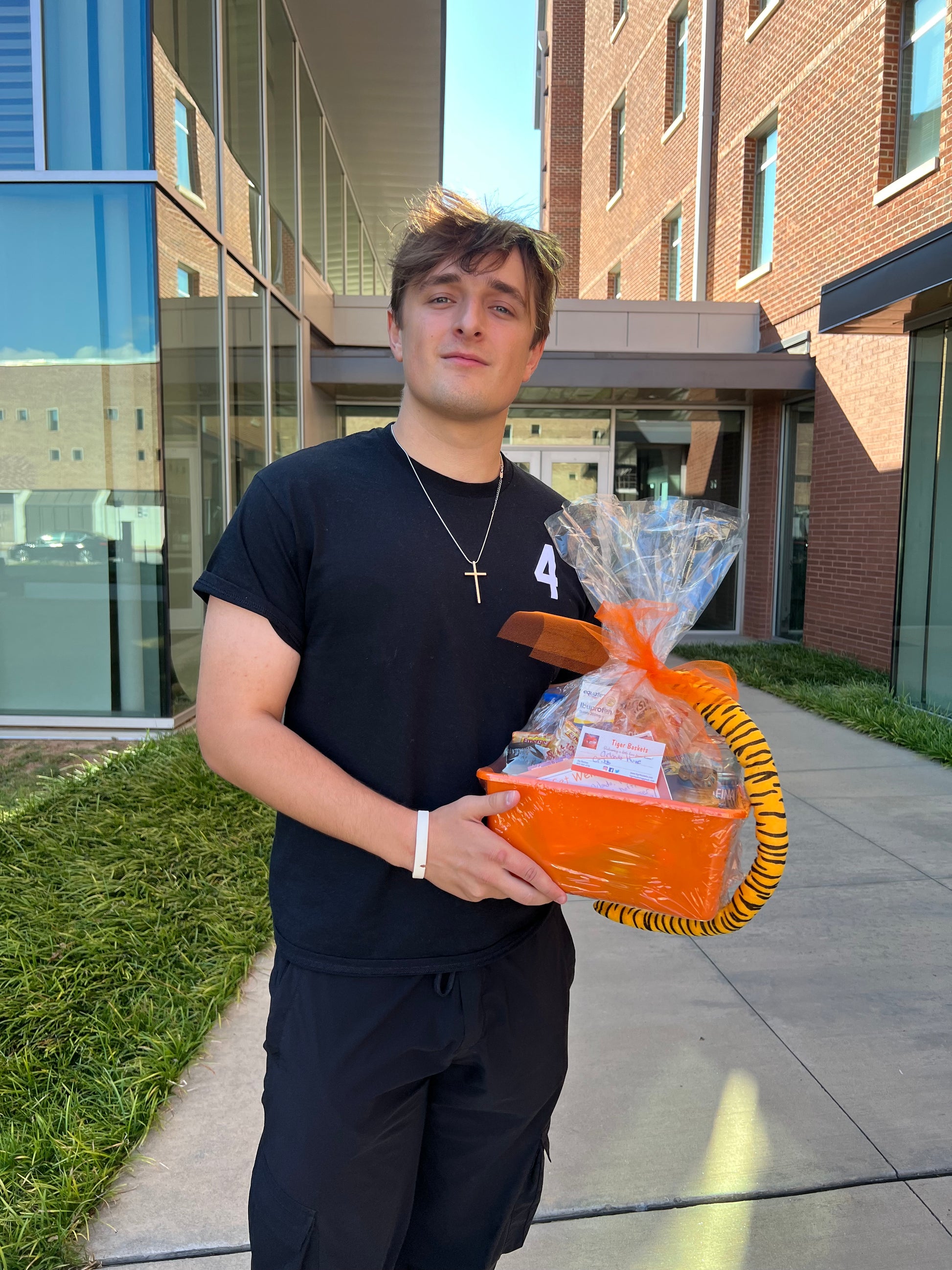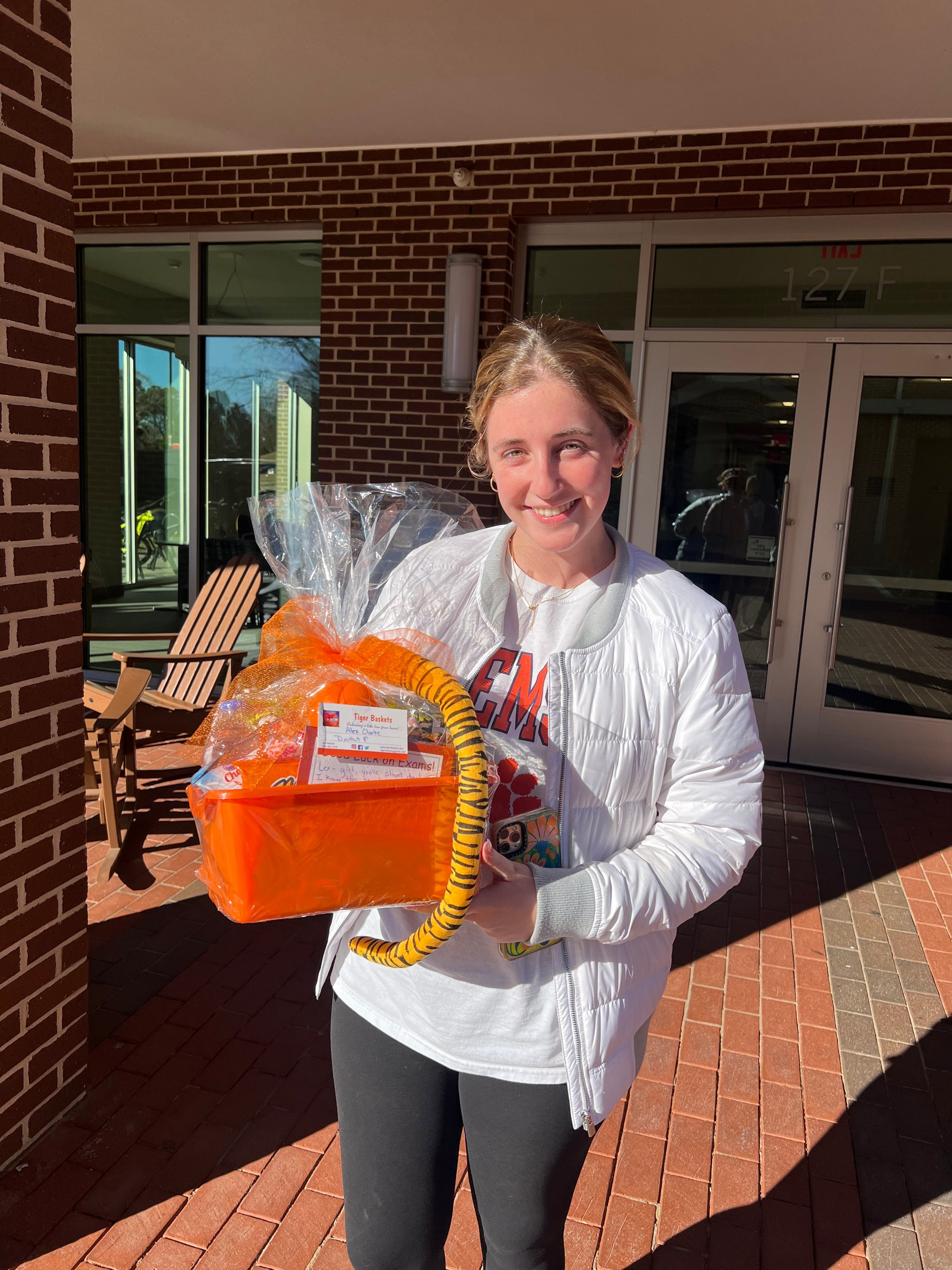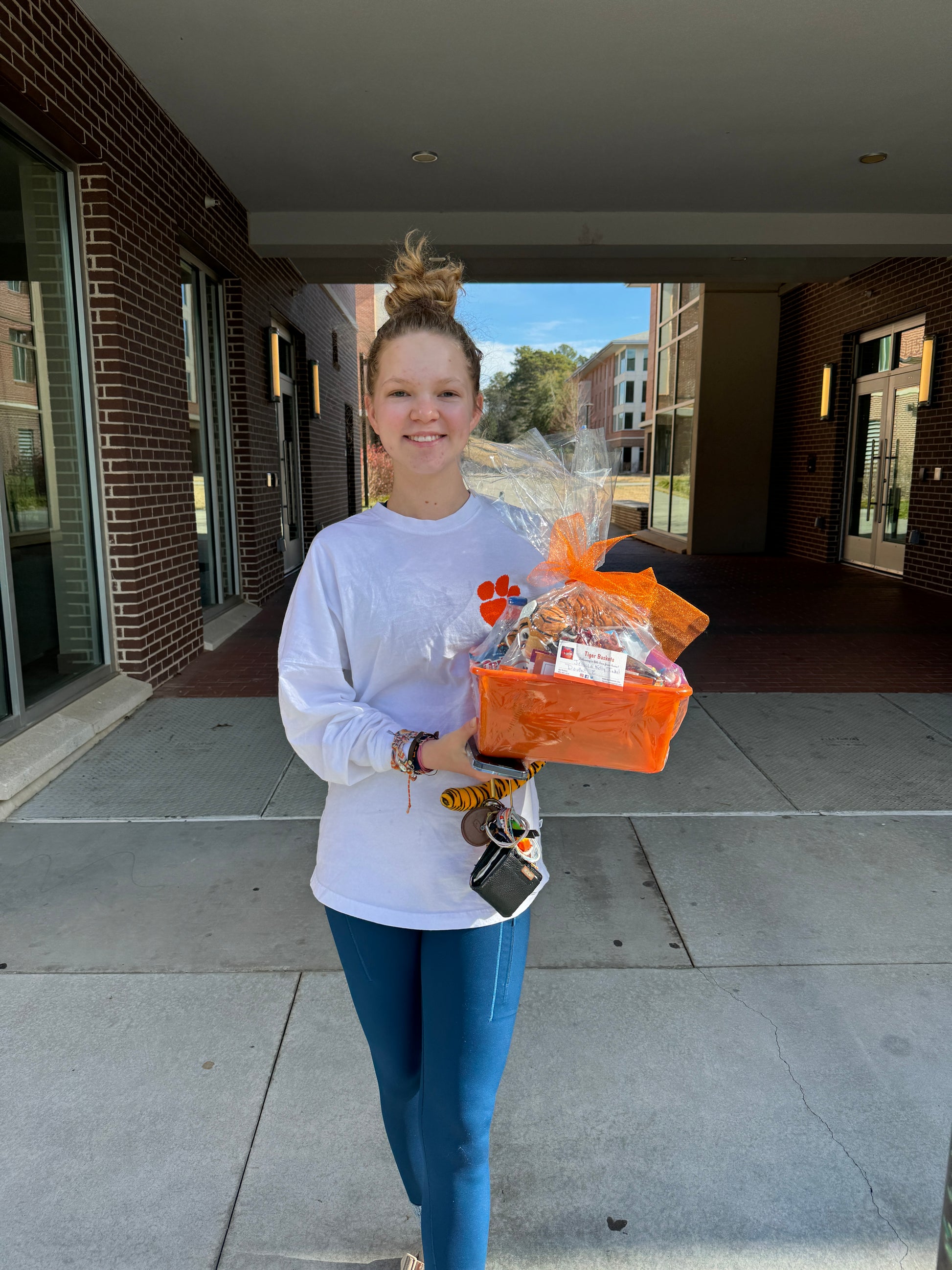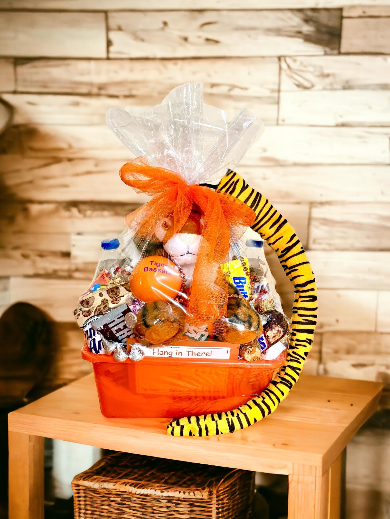 The Hang In There Basket can be sent anytime just to let them know you are thinking of them - when they are having a big test or project deadline, or they just need a little bit of encouragement. It includes a large soft plush Tiger, a stress ball, lots of chocolate - candy bars, cookies, Hershey kisses, and Reese's, as well as popcorn, bottled waters, a can of Orange Crush, bubble gum, suckers, and peppermints. We include your personal message on a Hang In There card, shrink-wrap it, tie it up with an orange bow and add one of our signature plush tiger tails before we deliver it to your student at their dorm or local residence.