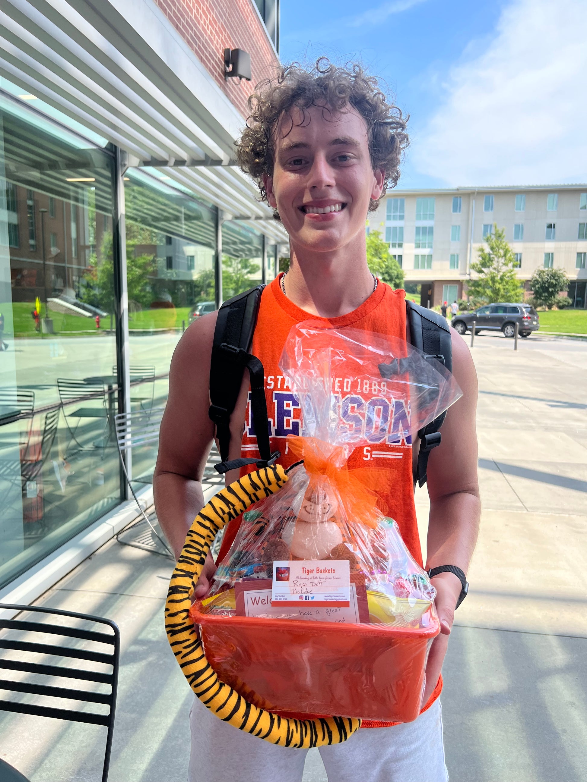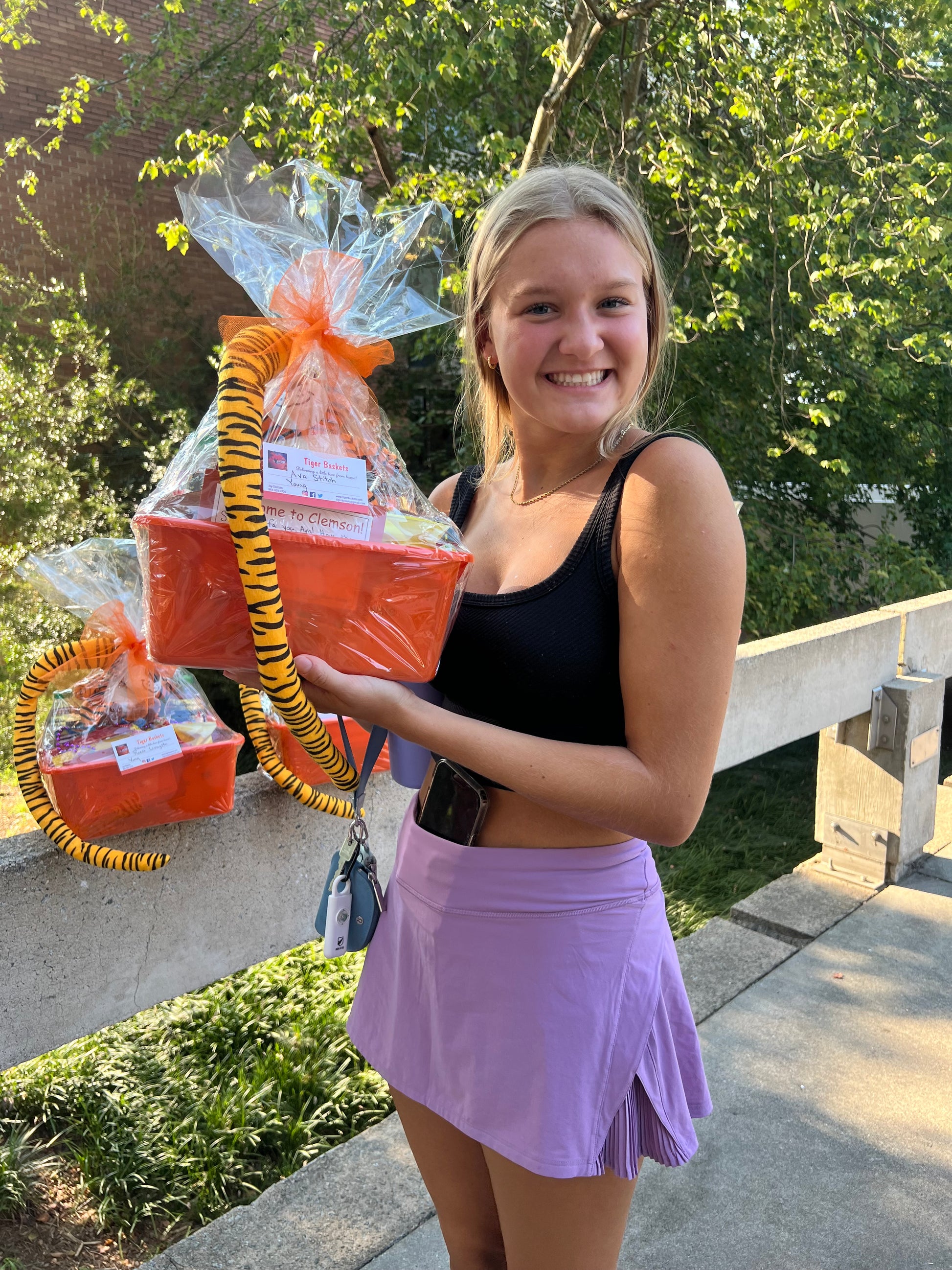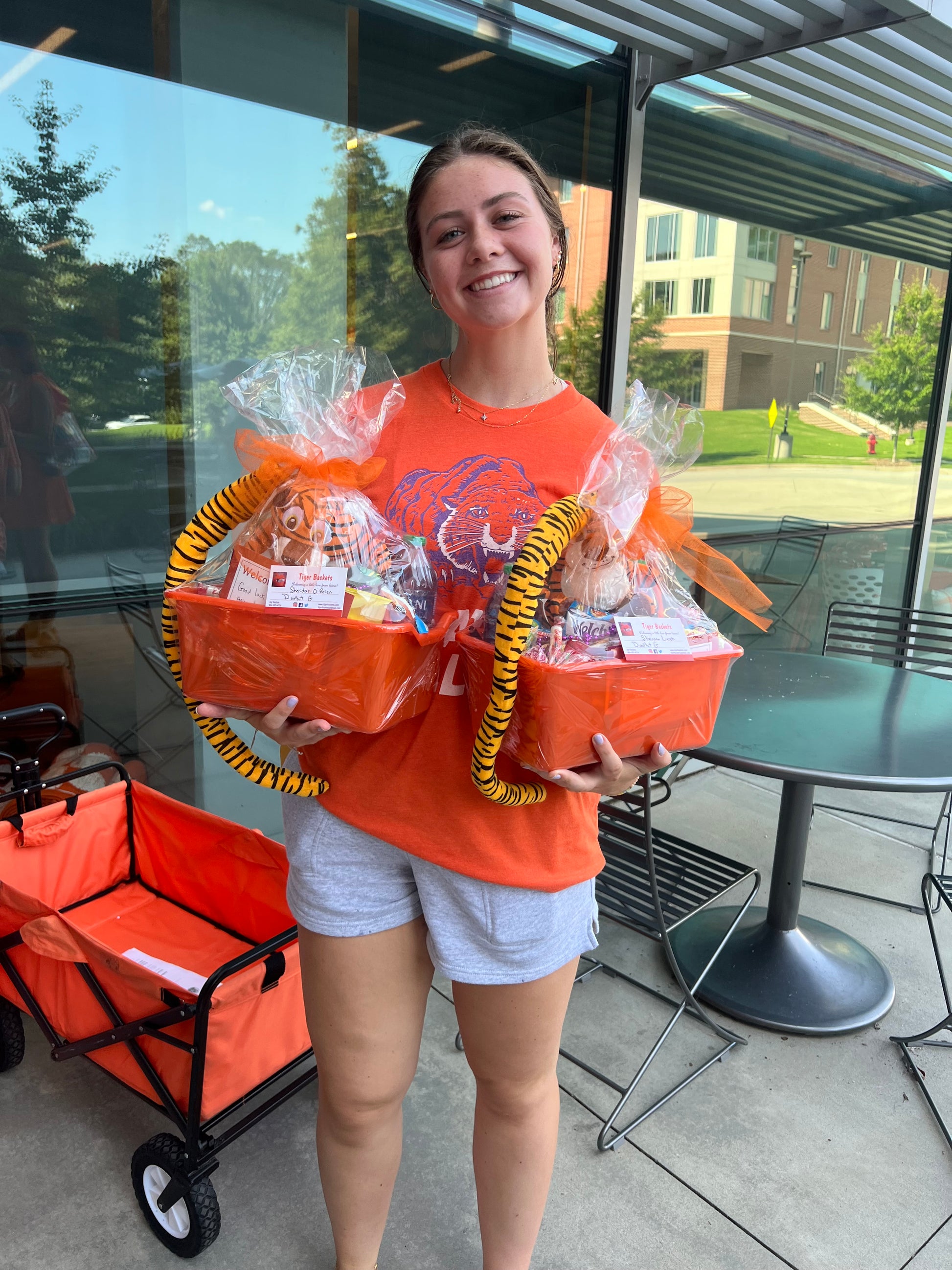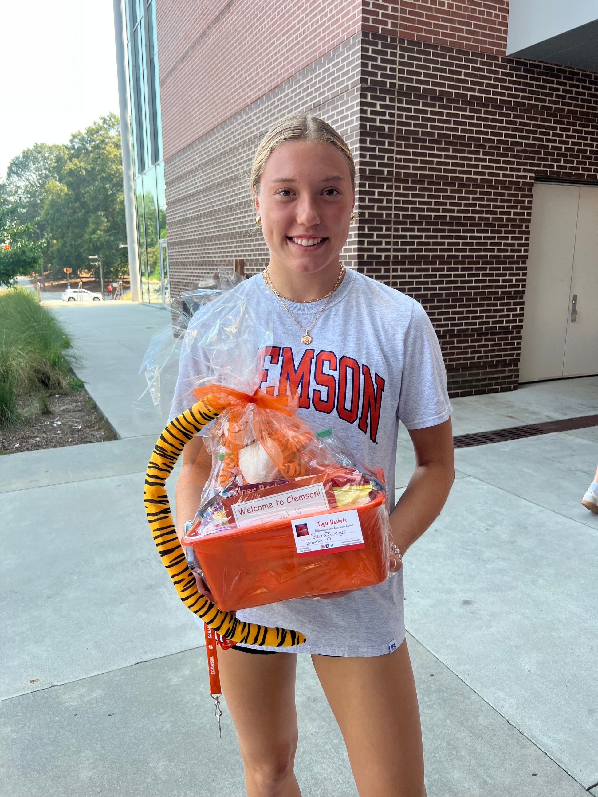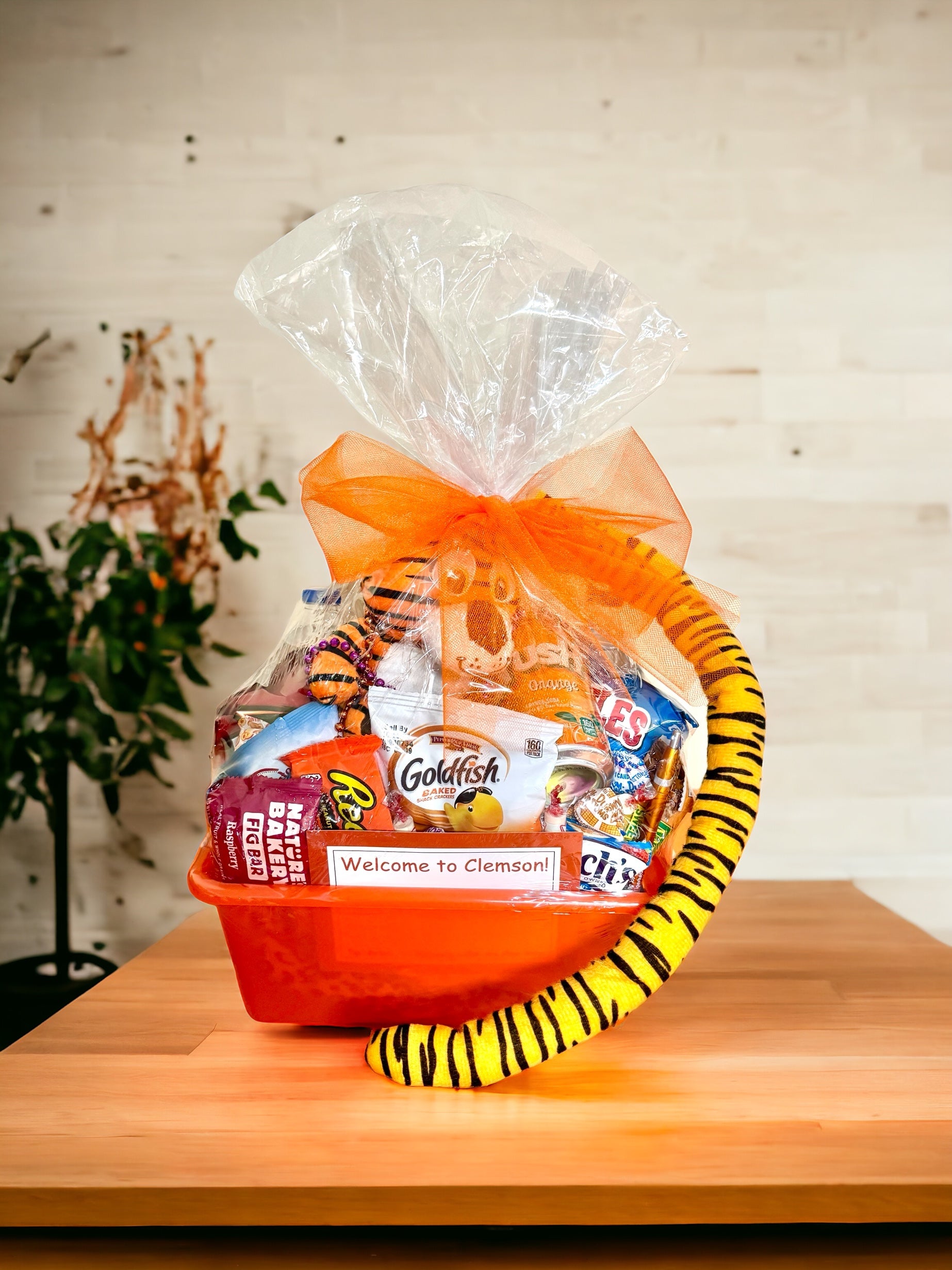 The Tiger Welcome Basket is one of our most popular baskets. It is perfect to send at the beginning of the semester to get your student off to a great start but it can be ordered anytime during the year. It includes a plush tiger and is filled with chips, granola bars, crackers, cookies, candy bars, microwave popcorn, Ramen noodles, bottled waters, a can of Orange Crush soda, fruit snacks, peppermints, bubble gum, suckers, and a pen. We add your personal message on a Welcome to Clemson card, shrink-wrap it, tie it up with a bow and add one of our signature plush tiger tails before we deliver it to your student at their dorm or local residence.