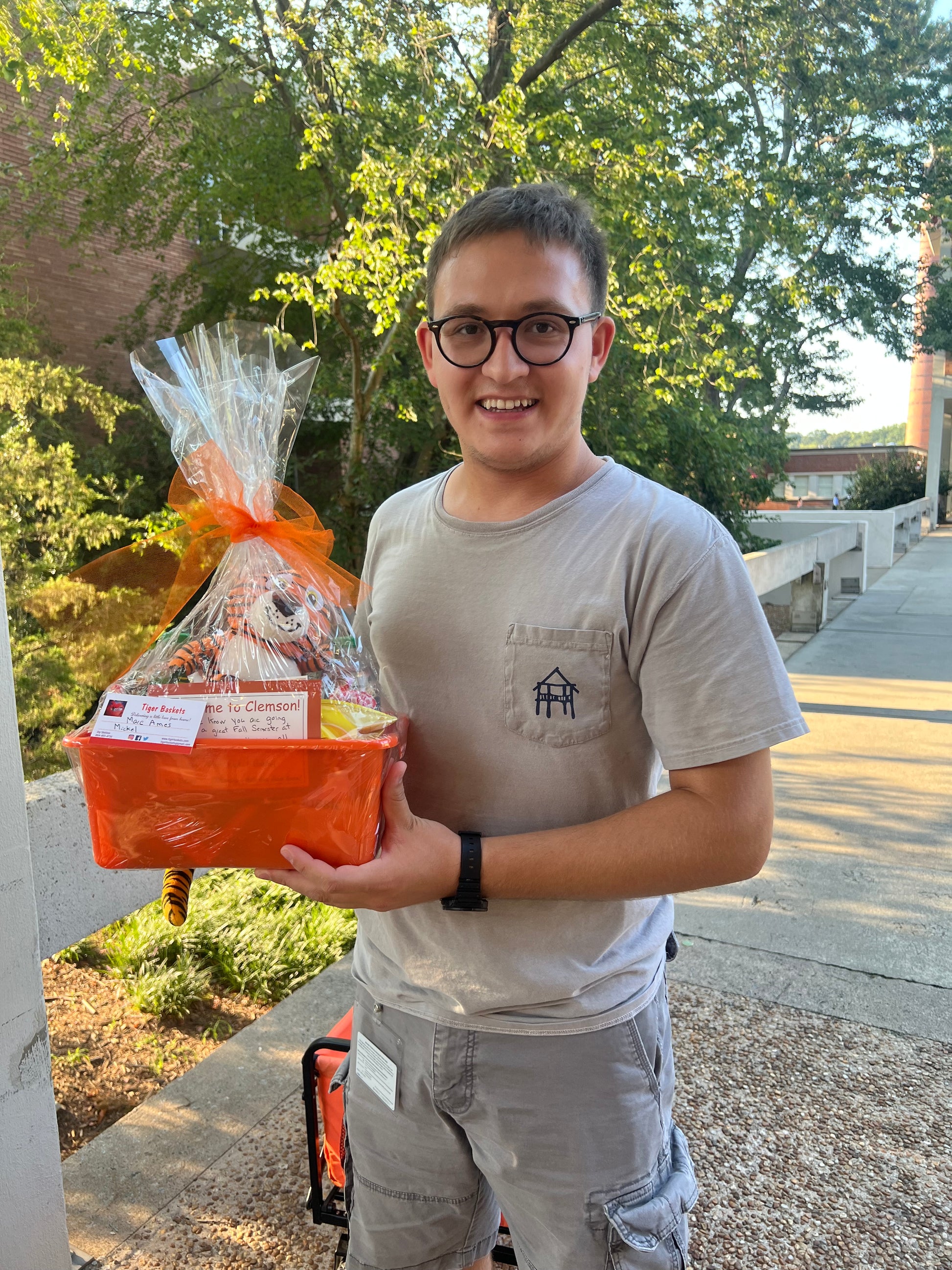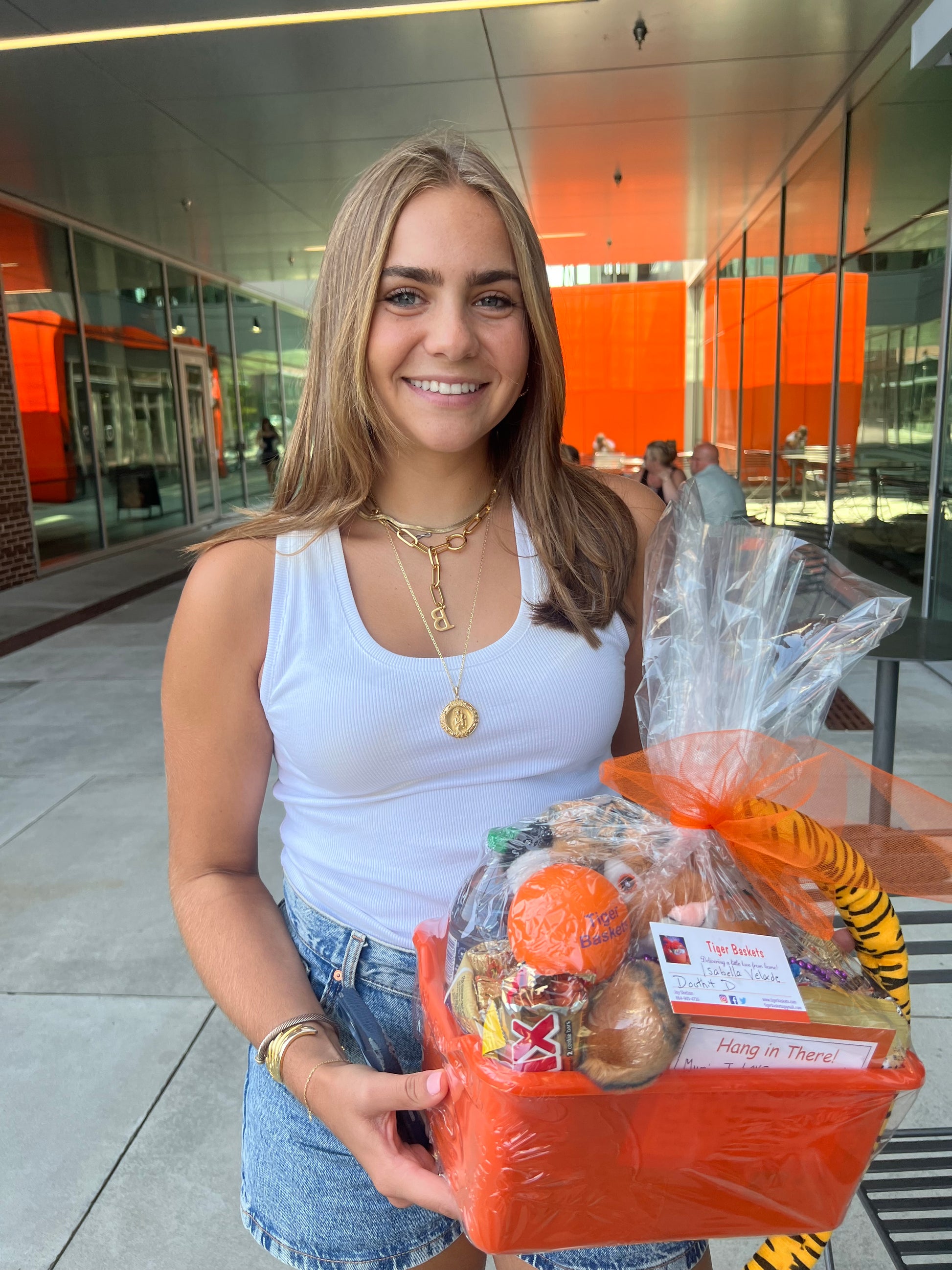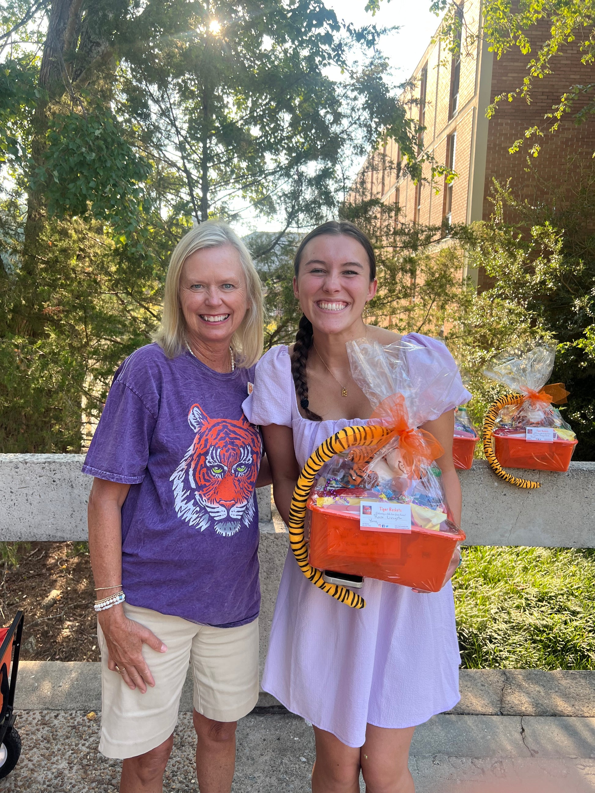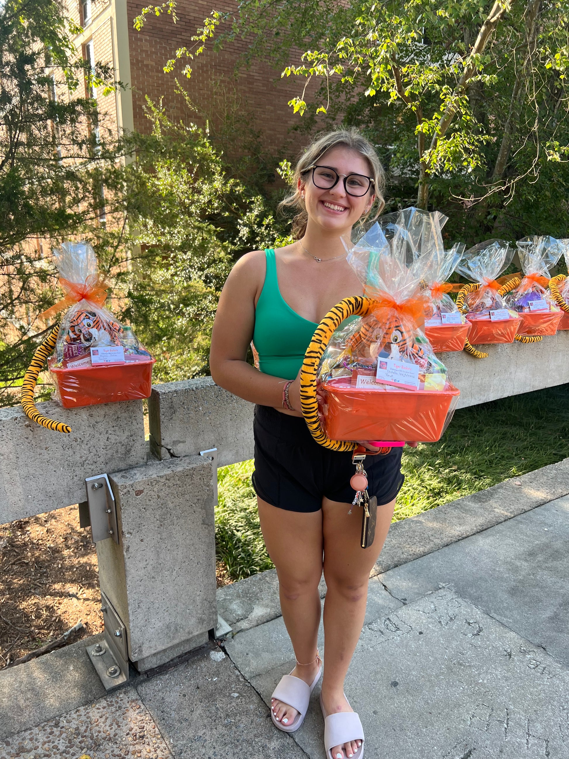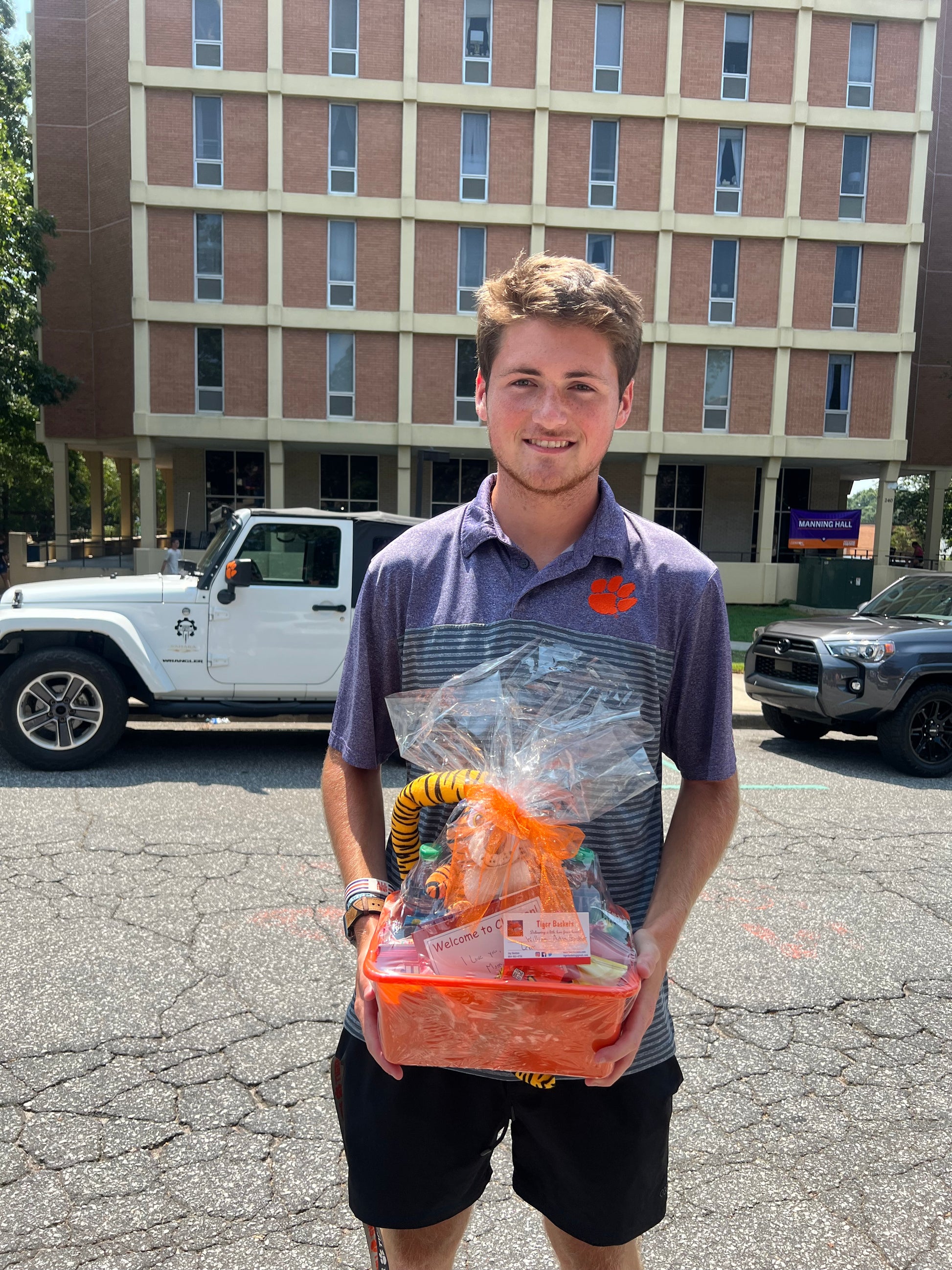 The Tiger Welcome Basket is one of our most popular baskets. It is perfect to send at the beginning of the semester to get your student off to a great start but it can be ordered anytime during the year. It includes a plush tiger and is filled with chips, granola bars, crackers, cookies, candy bars, microwave popcorn, Ramen noodles, bottled waters, a can of Orange Crush soda, fruit snacks, peppermints, bubble gum, suckers, and a pen. We add your personal message on a Welcome to Clemson card, shrink-wrap it, tie it up with a bow and add one of our signature plush tiger tails before we deliver it to your student at their dorm or local residence.