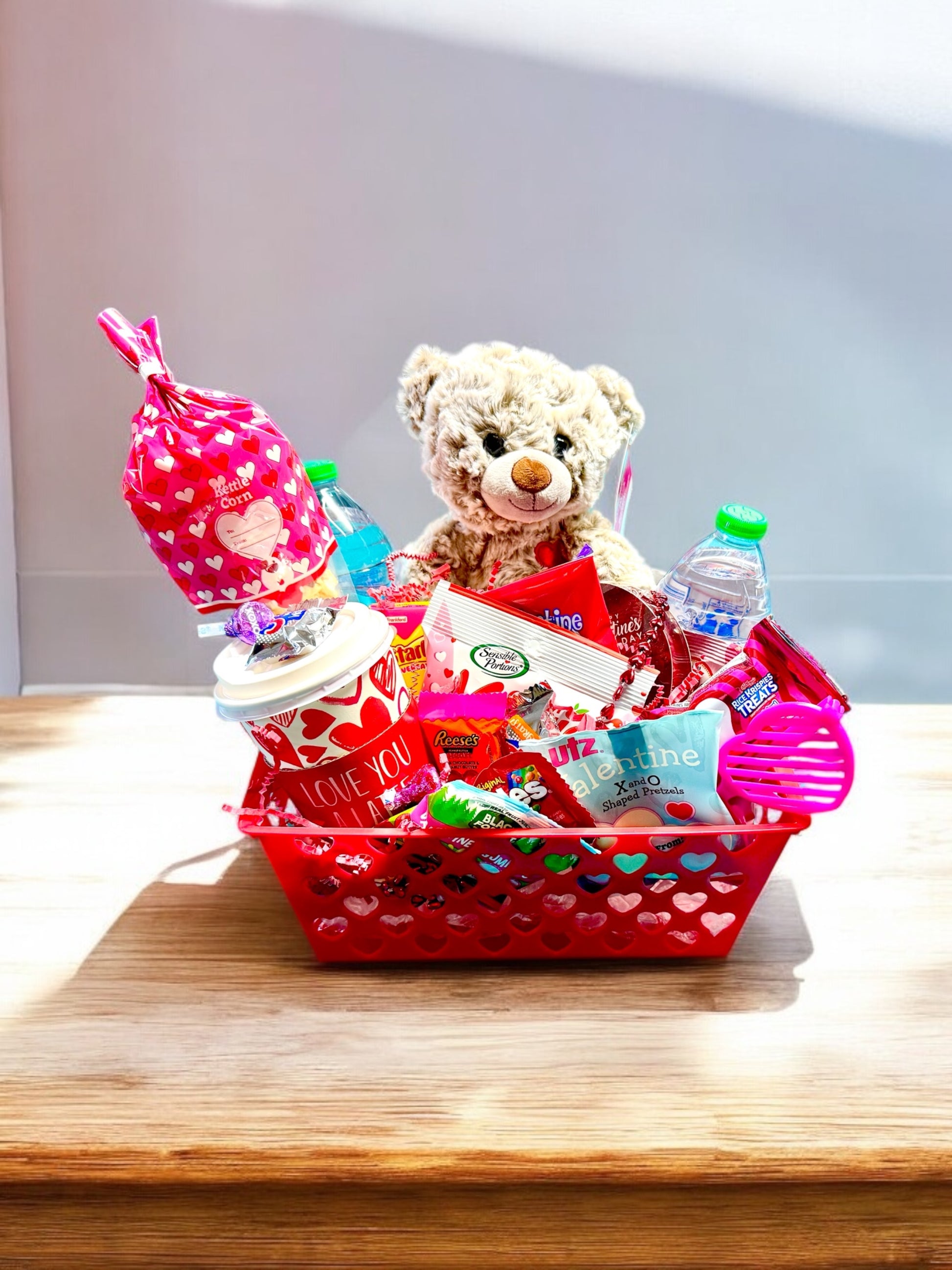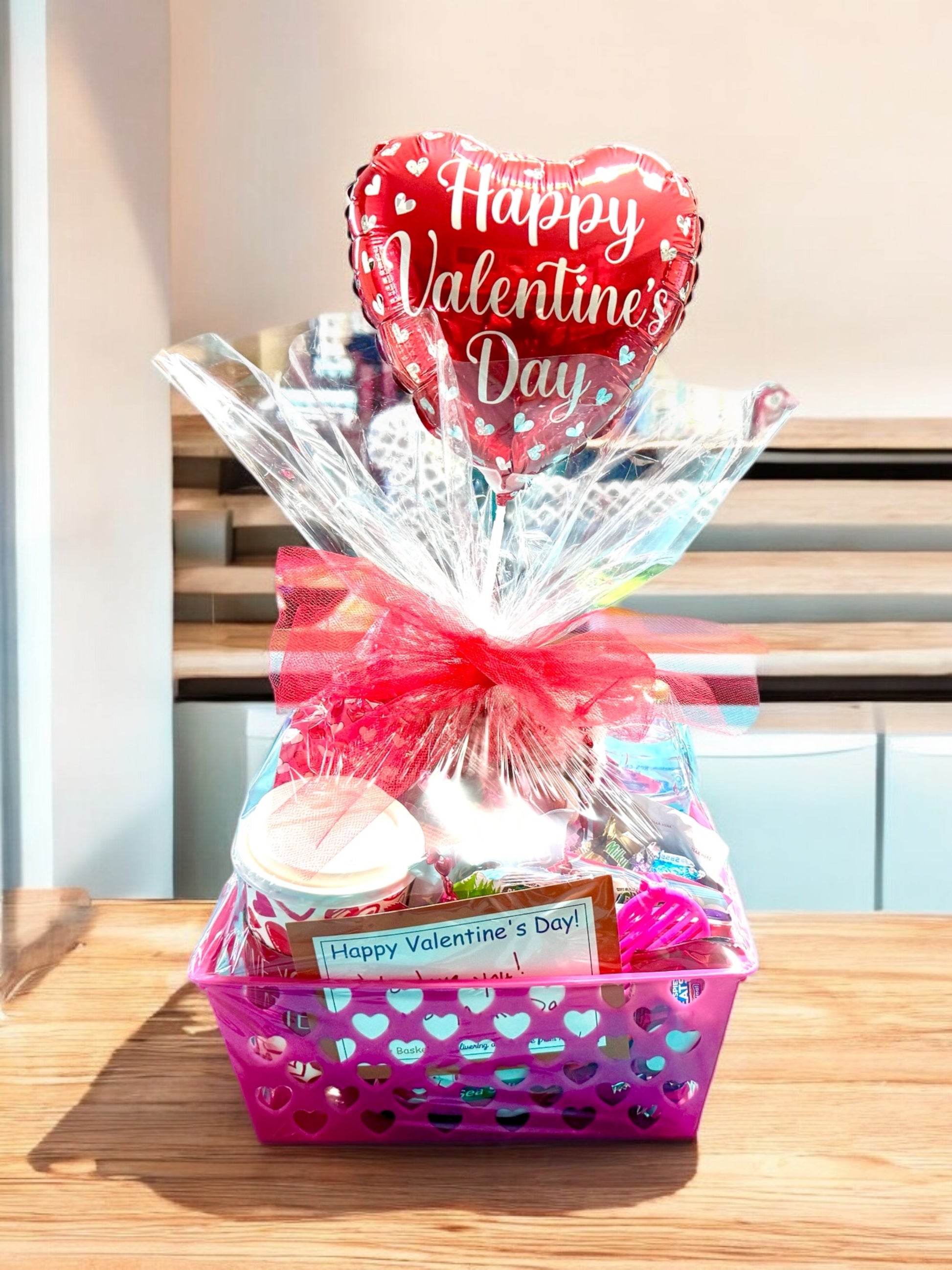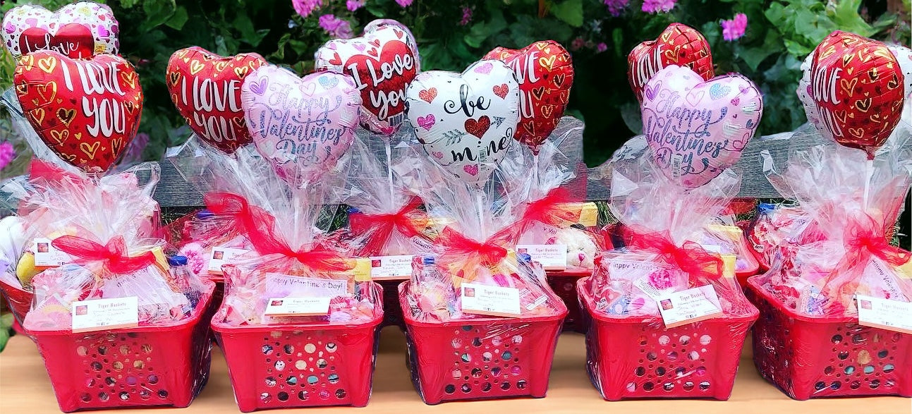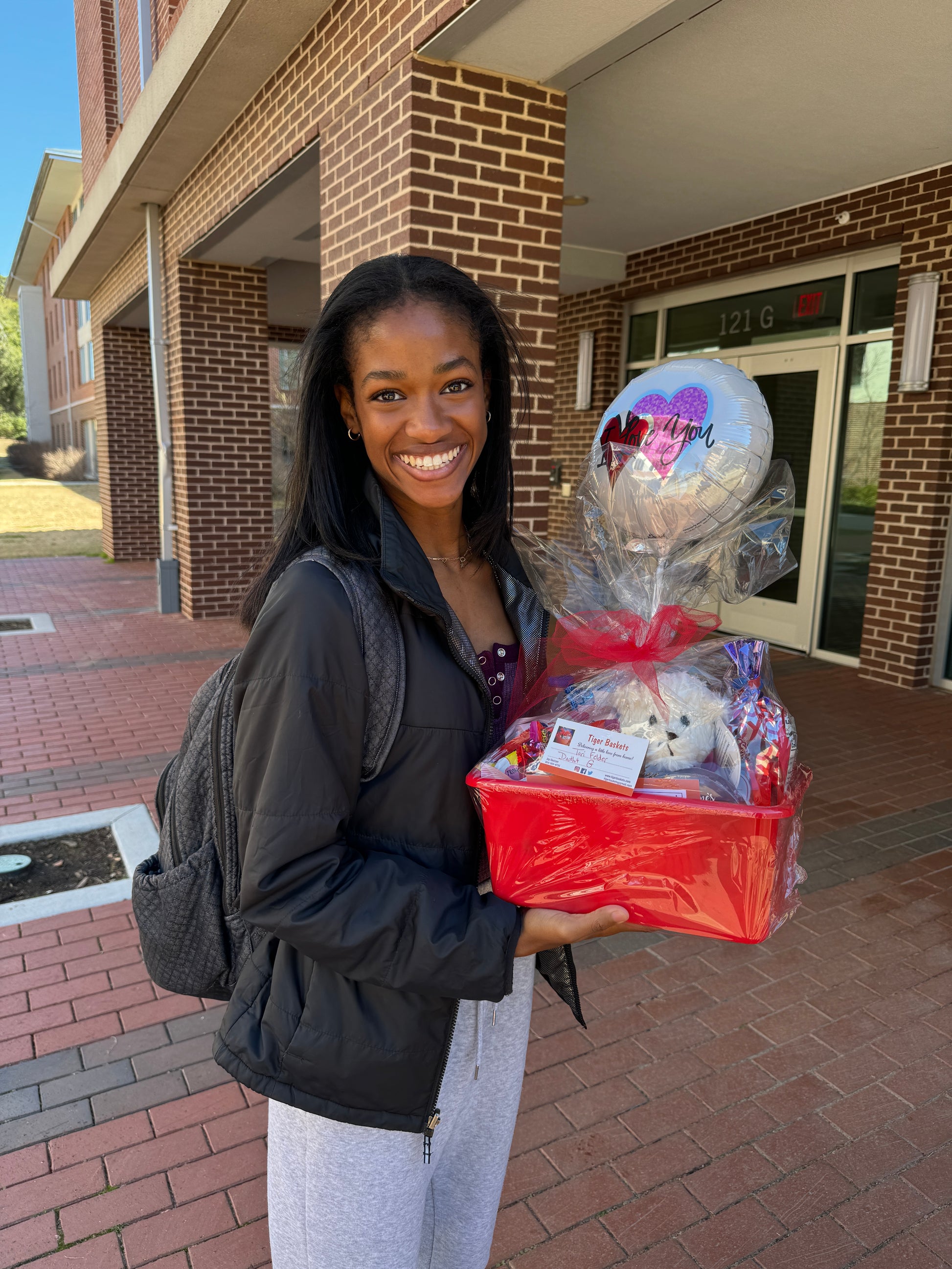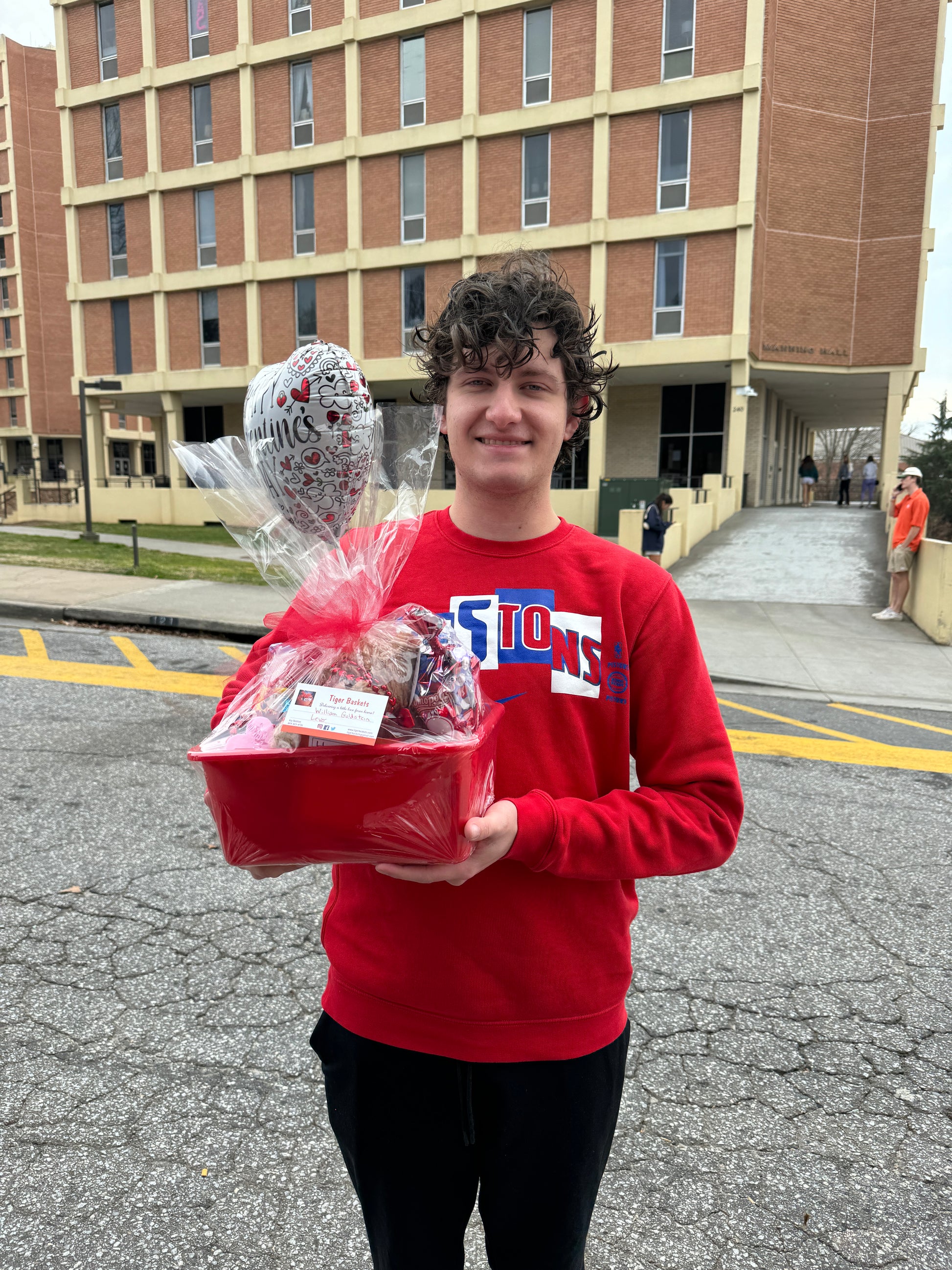 Our Valentine Basket is delivered to your student just prior to Valentine's Day. It is definitely one of our most popular baskets! It includes a plush Valentine bear, Valentine-themed: Rice Krispie treats, Skittles, Reese's hearts, Fruit Snacks, Mini Chocolate Chip Cookies, Veggie Straw Hearts, Kettle Corn, Ding Dongs, Conversation Hearts, a Heart shaped box of Chocolates, a Valentine To Go Cup and Swiss Miss Hot Chocolate mix, bottled waters, assorted Valentine candy, Valentine beads and other Valentine novelty items. We add your personal message on a Happy Valentine's Day card, then it is shrink-wrapped, tied with a red bow, and topped off with a Mylar Valentine balloon. The basket is delivered right to your Clemson student at their dorm or apartment just prior to Valentine's Day.